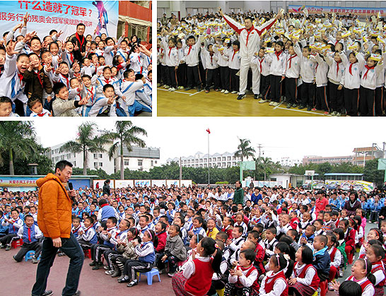 2010年-2011年,廈門國貿(mào)集團與本市外來員工子弟學校、蔡塘學校、梧侶學校、僑英中心小學、文安小學等5所掛鉤的農(nóng)民工子女學校簽訂了結(jié)對關愛協(xié)議,開展“愛與夢飛翔”關愛農(nóng)民工子女系列活動?;顒訂雍螅瑲垔W冠軍侯斌相繼在5所結(jié)對的農(nóng)民工子弟學校進行了6場勵志演講,帶領5所學校的農(nóng)民工子女代表共同揚起彩色翅膀,帶著五彩斑斕的夢想飛向天空… …