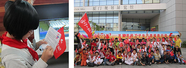 2011年10月,廈門國貿(mào)集團“愛與夢飛翔”志愿者帶領廈門市文安小學學生參觀廈門規(guī)劃展覽館。在規(guī)劃展講解員的帶領下,學生們親身感受了廈門的發(fā)展,體驗有趣的環(huán)形影院和各式各樣的最新科技,實實在在的了解了每天生活的城市,通過感受特區(qū)發(fā)展,也加深了他們對生活的熱愛,激勵學生懷抱建設家園的夢想,積極向上。
